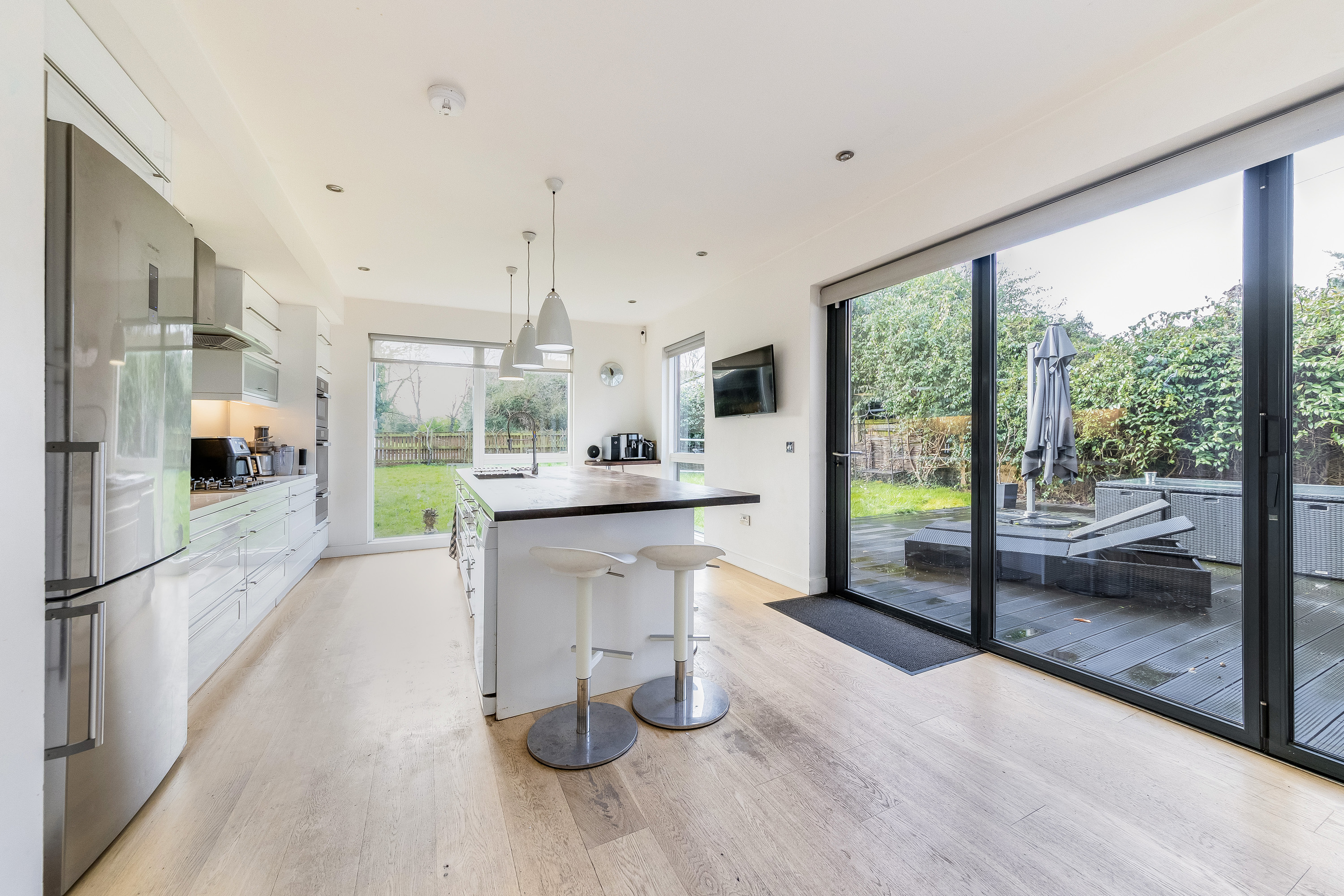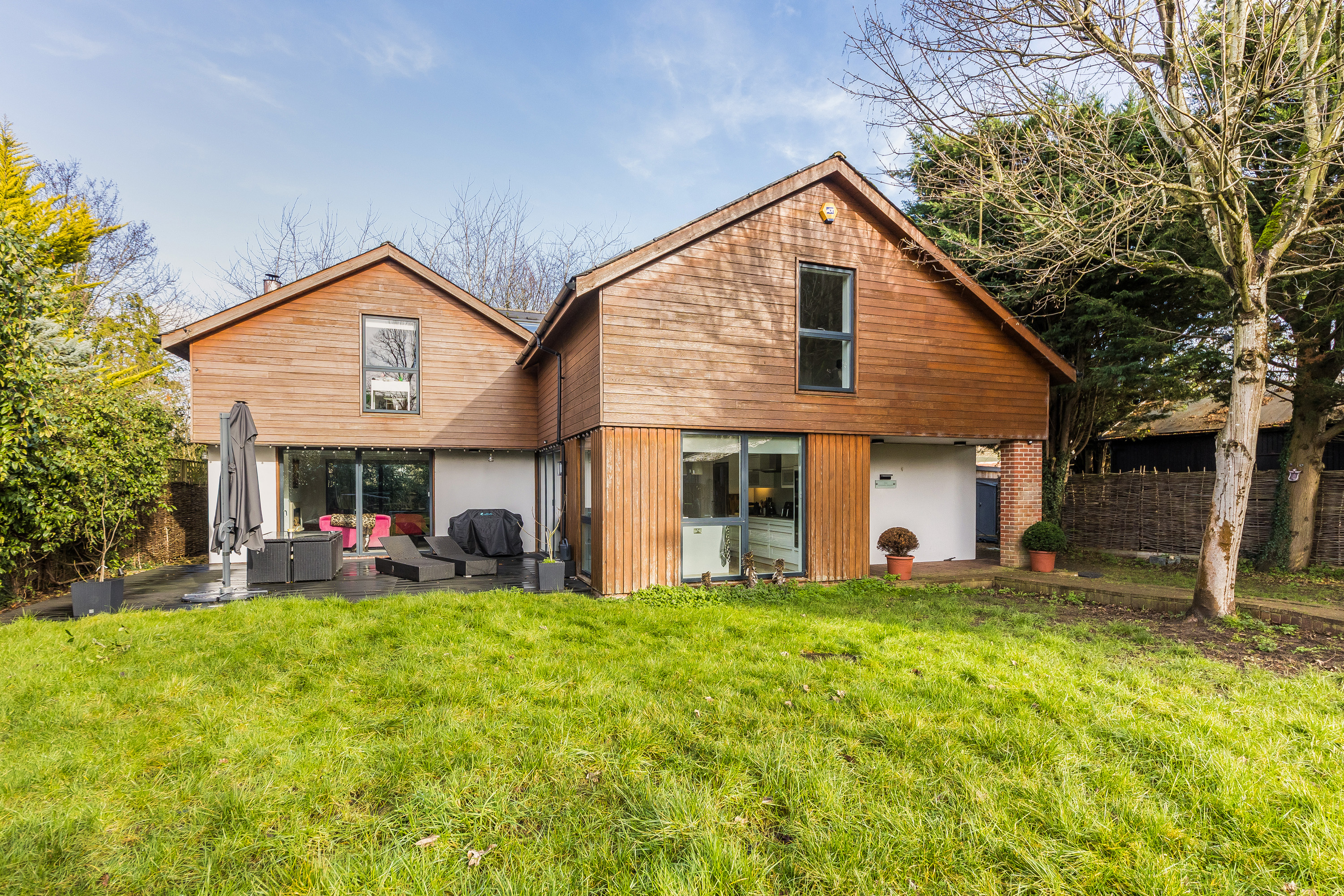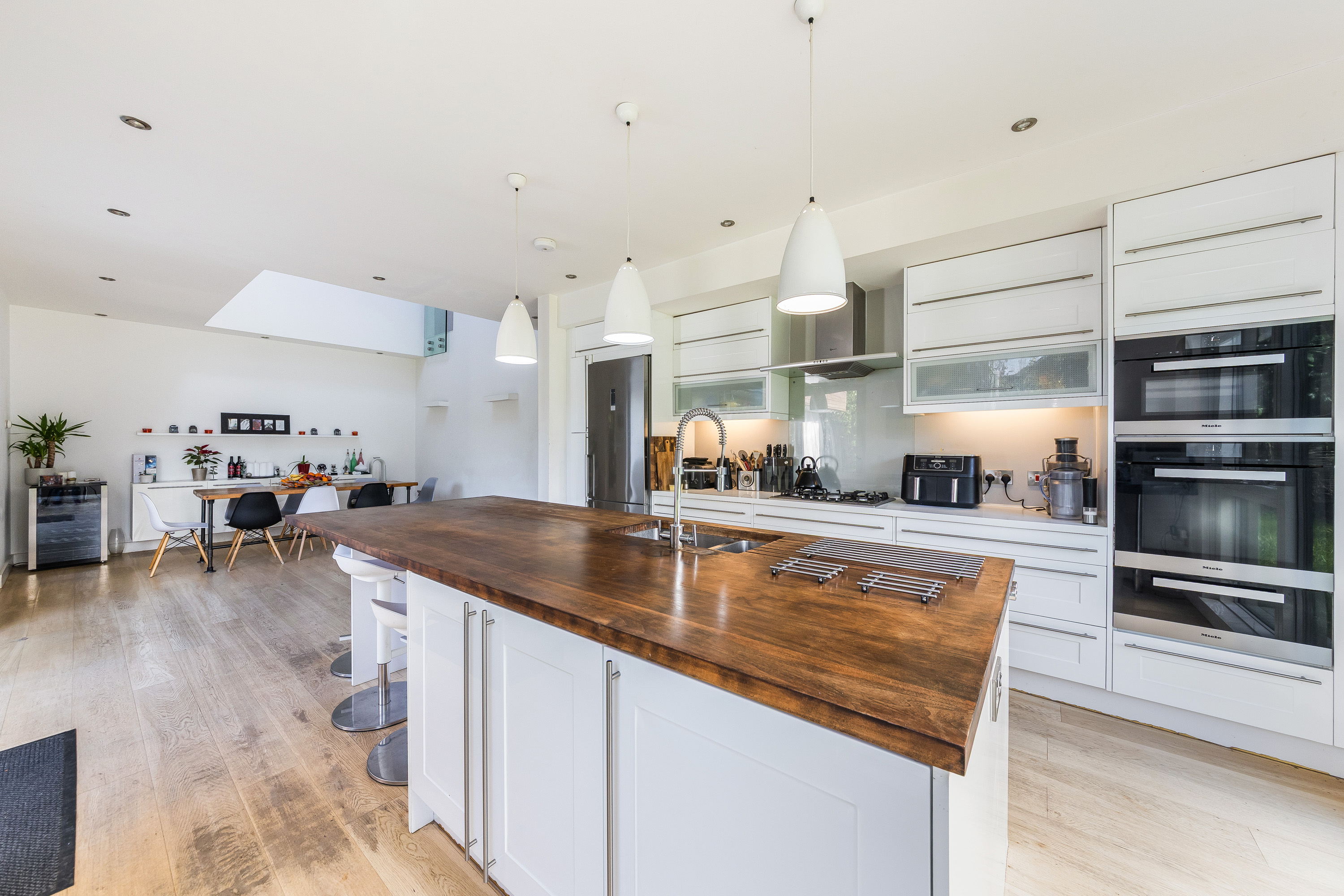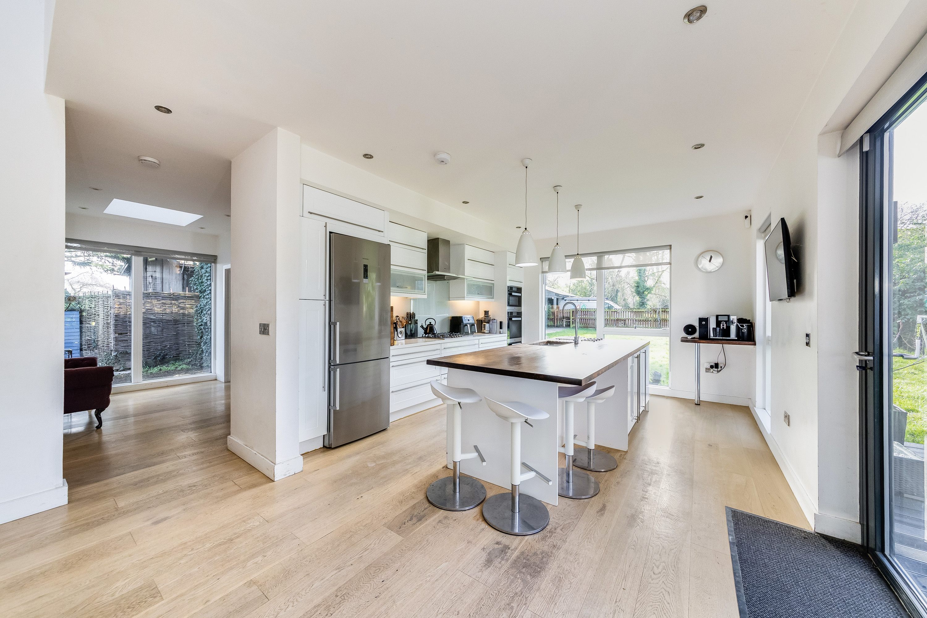 The property was built in 2009 and offers flexible accommodation with over 3000 sq ft of living space, detailing great light levels, soaring ceiling lines and glass elevation detail opening up the key spaces to private gardens.