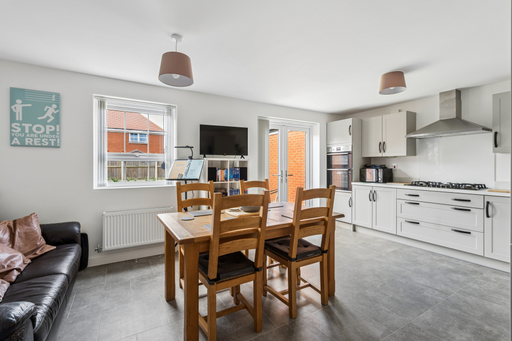 A four bedroom detached house, contemporary in design with an impressive kitchen/family room, two bath/shower rooms, cloakroom and separate sitting room. South west facing garden, garage and driveway parking for 3 cars.