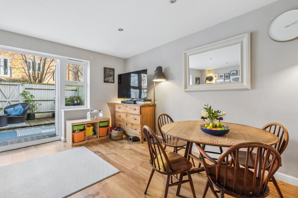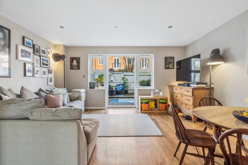 Conveniently located town house offering three double bedrooms, large open plan ground floor reception room, two bath/shower rooms and optional top floor study/dressing room. Enclosed garden and two allocated parking spaces.