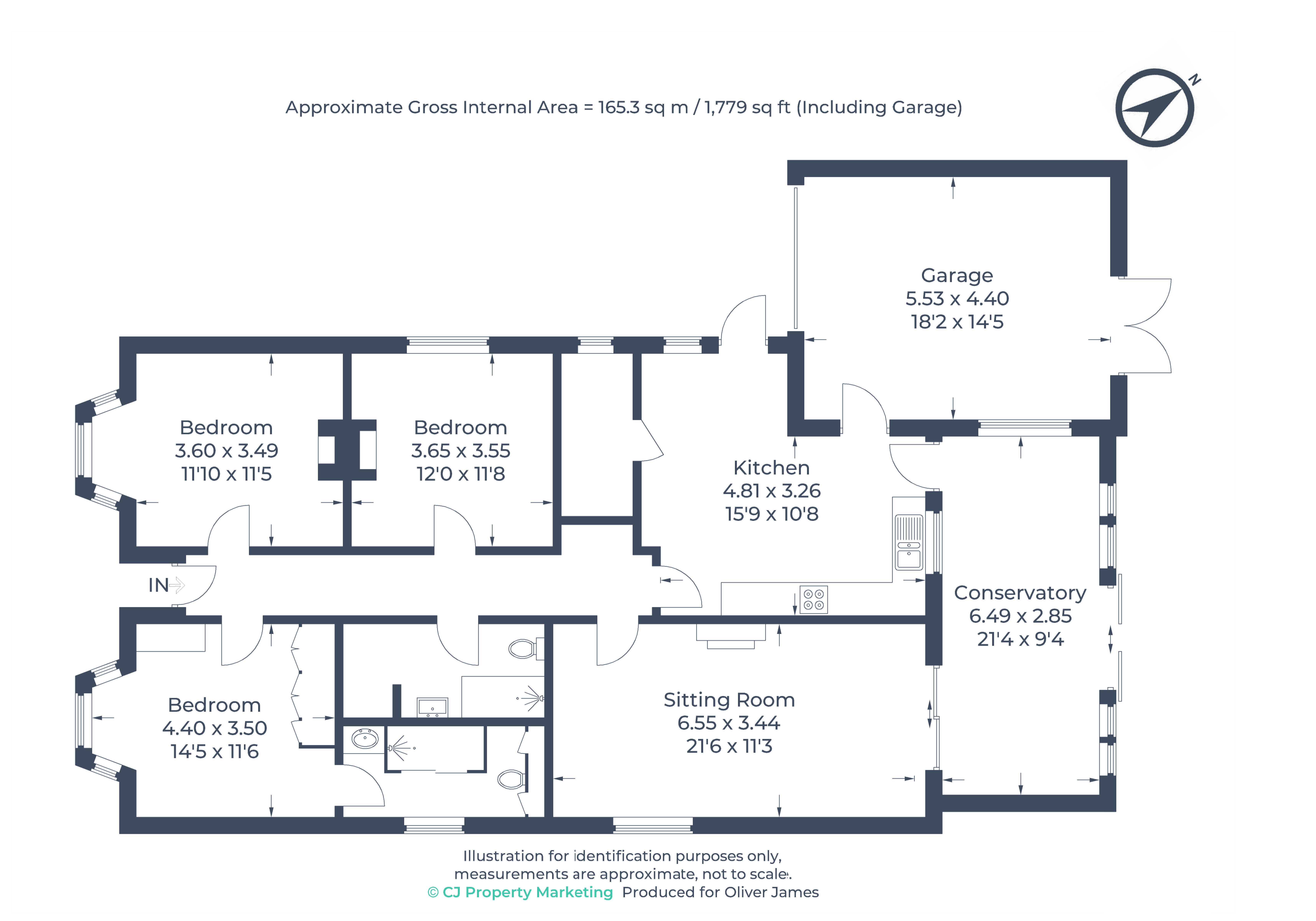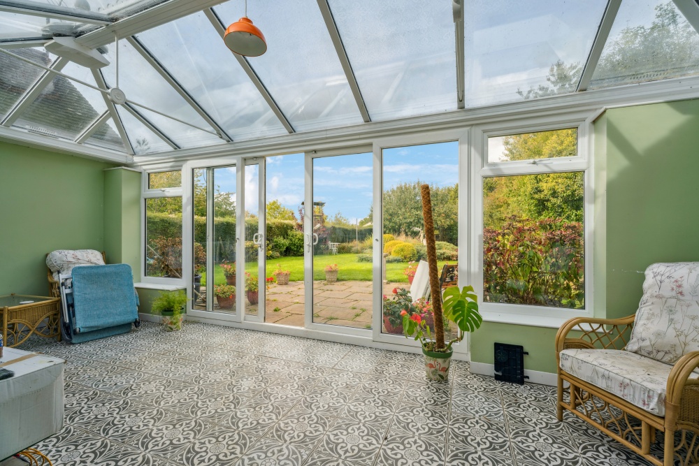 The property is accessed via a long driveway and offers 1779 sq ft of space including the 18ft x 14ft garage. Accommodation consists of three double bedrooms, two bath/shower rooms, 21ft Sitting room, conservatory and re-modelled kitchen.
